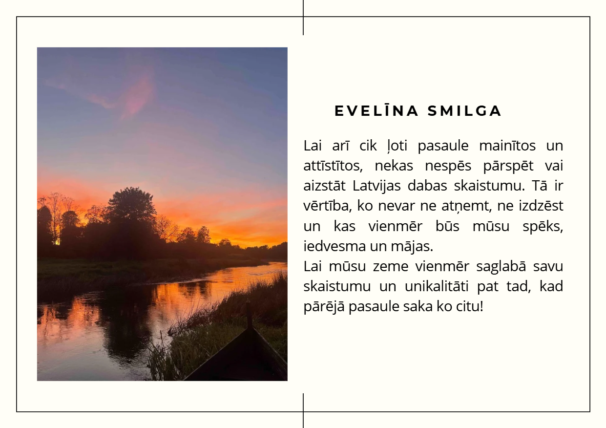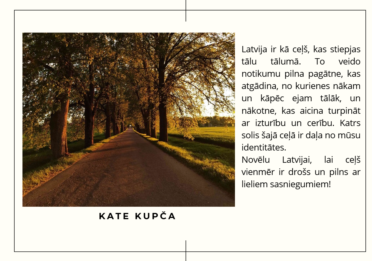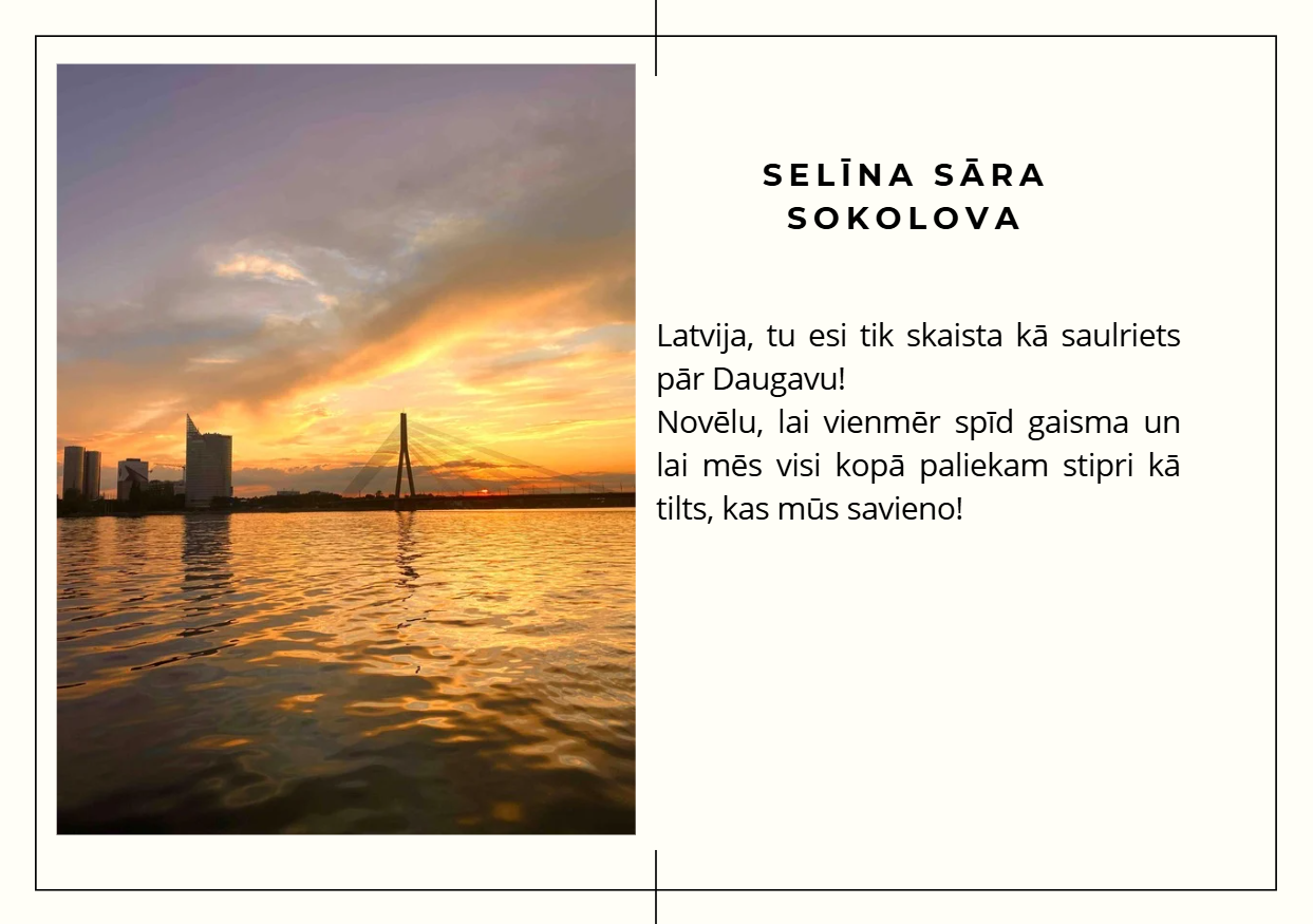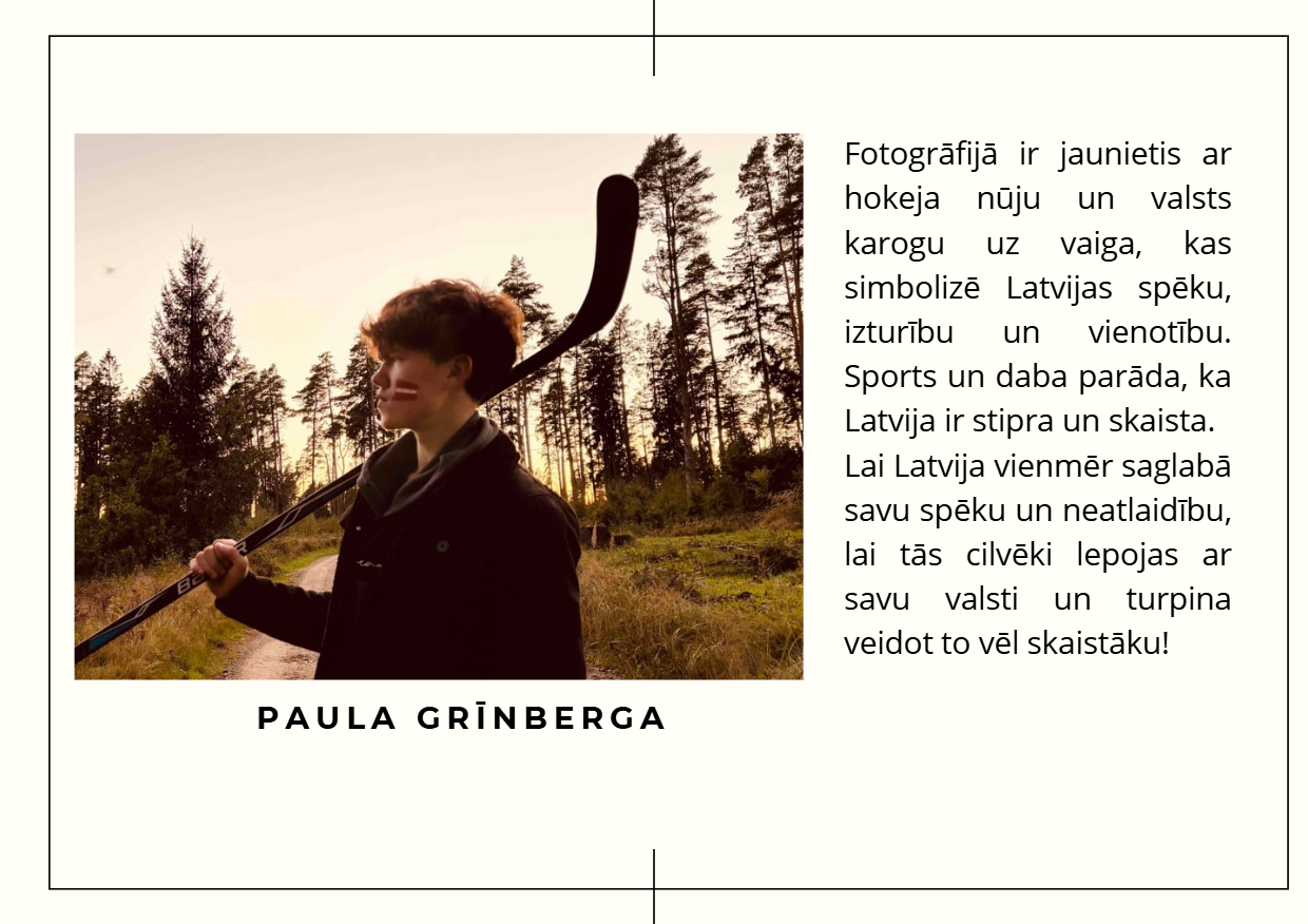 Aicinām ielūkoties 10. klašu jauniešu skatījumā uz Latviju — viņu fotogrāfijās atspoguļojas mīlestība pret dzimteni, piederības sajūta un lepnums par vietu, ko saucam par mājām. Katrs attēls ir personīgs stāsts par to, kāpēc Latvija ir vieta, kur jūtas piederīgi.